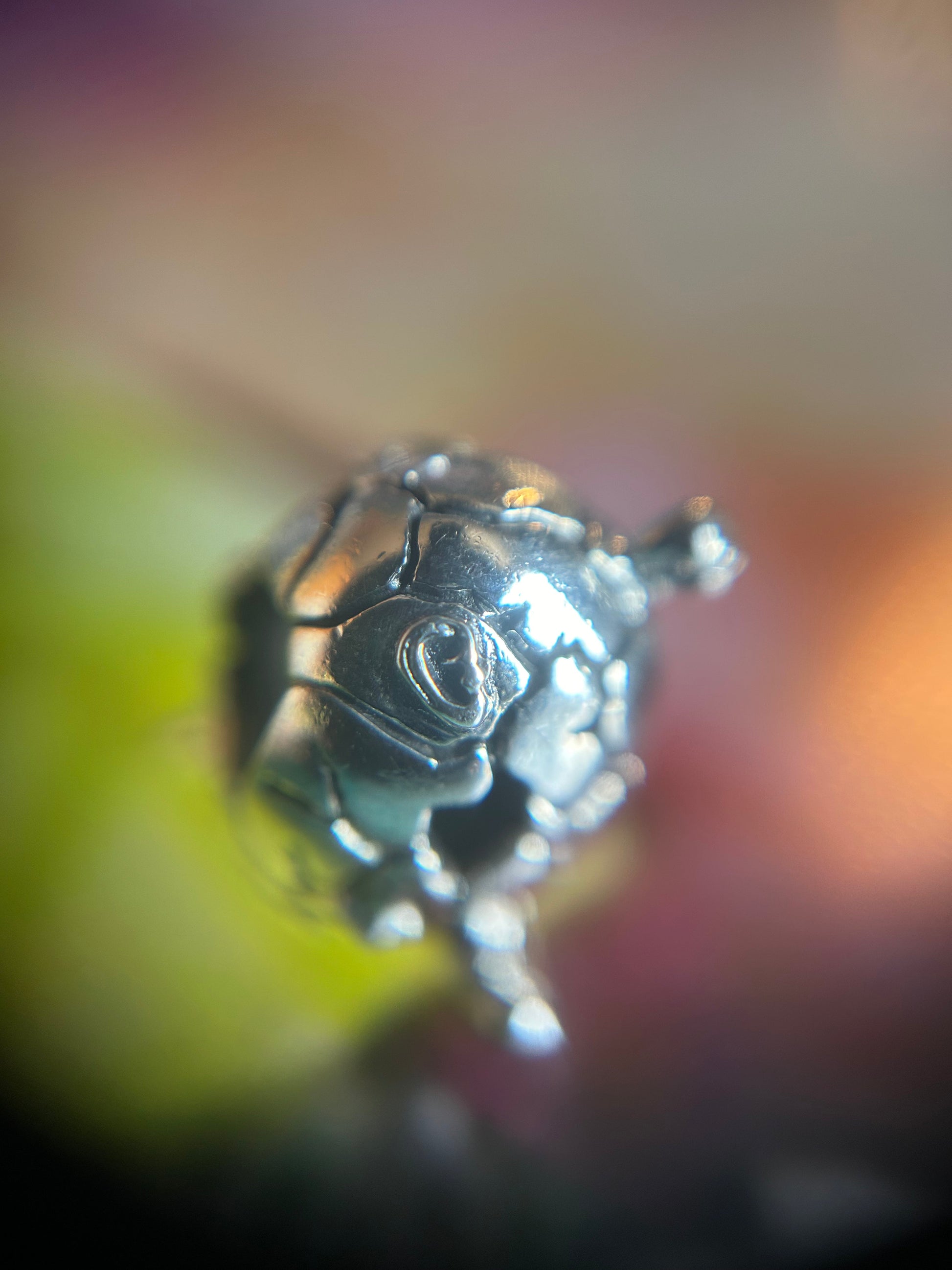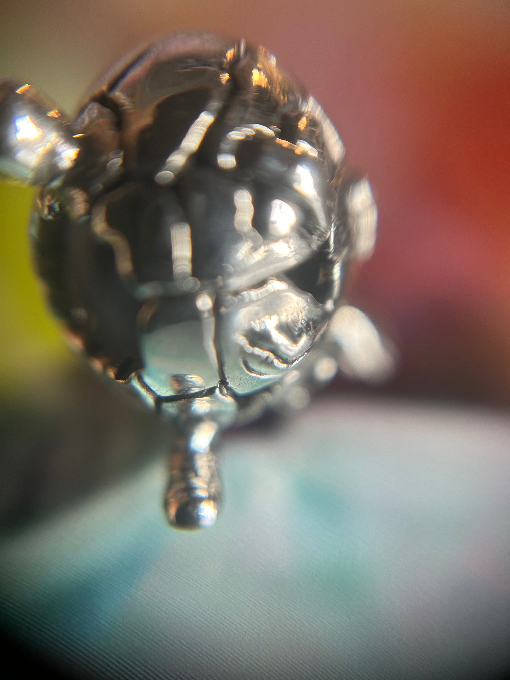 The bead would be in a shape of an egg with a man's legs and arms. The egg cracked and pieces broke out. The mouth, ears, and eyes are all mixed up. And legs and arms off-kilter slightly. I imagine him wearing pants with a belt. A big set of lips in a turned-up smile.